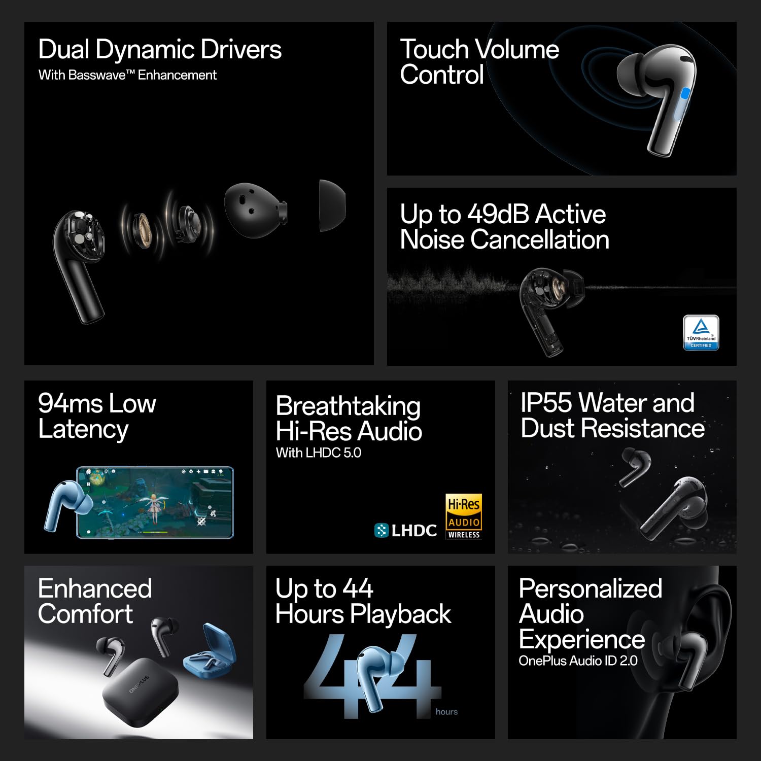 [Best-in-class Sound Quality]: 10.4mm+6mm dynamic dual driver, LHDC5.0 Bluetooth CODEC and high resolution certification makes the product best in its sound quality with deeper bass, delicate treble and clear vocals; [Sliding Volume Control]: Slide on the surface of touch area of buds to adjust the volume.Sliding up increases the volume, while sliding down decreases the volume