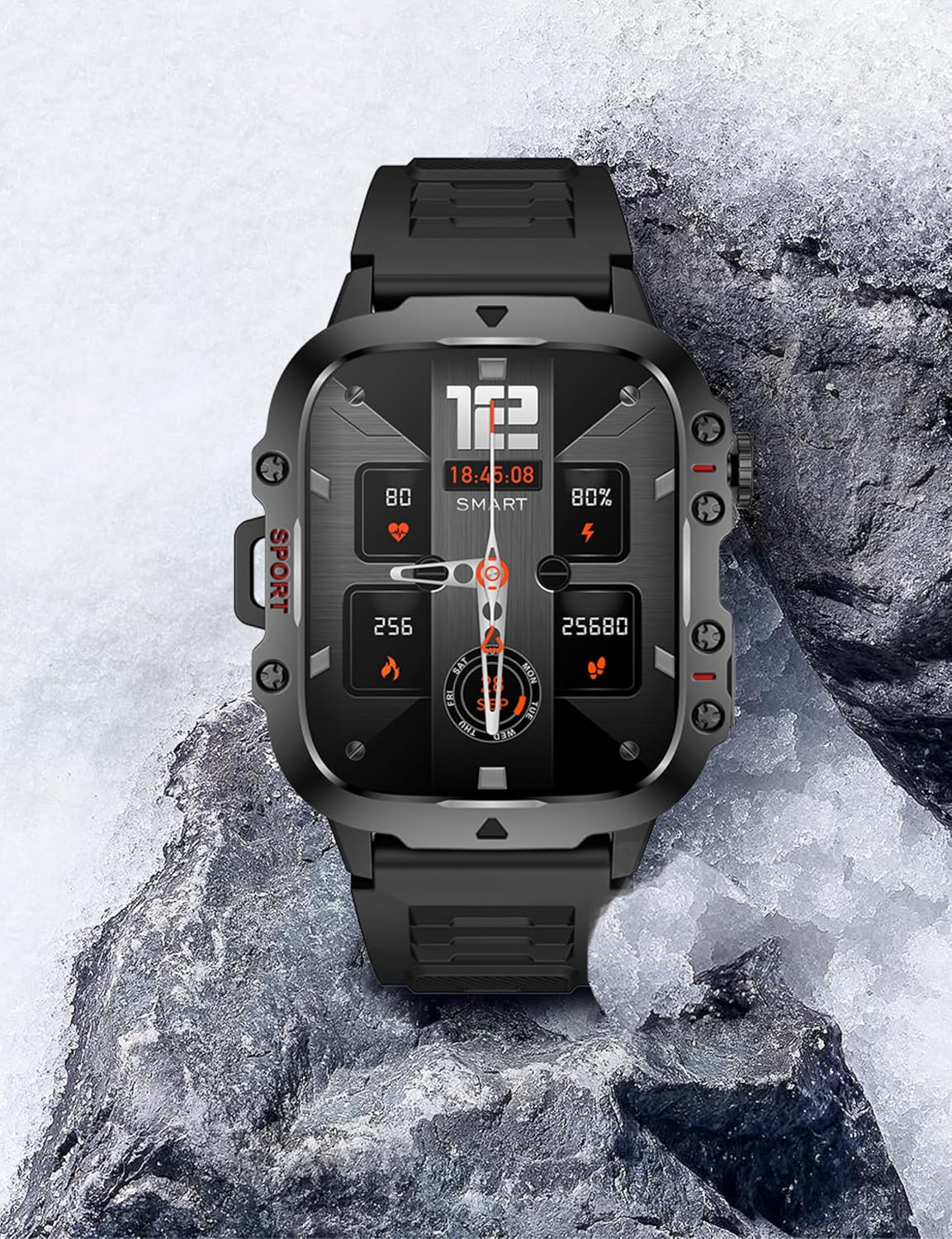 Time Display, SOS Button, BP, Heart Rate, SPO2, Sleep Tracker, BT Phone Call, 100+ Sports Features