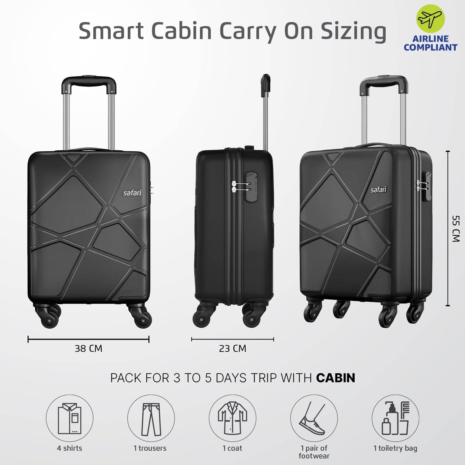 Safari Polypropylene (Pp) Pentagon Hardside Small Size Cabin Luggage Suitcase 4 Spinner Wheels Trolley Bags for Travel Black Color 55 Cm